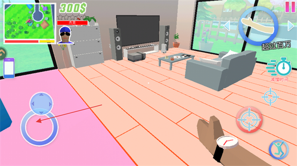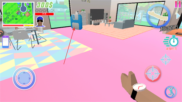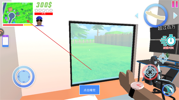 2、查看左上角地图,了解场景布局,收集资源如300$,点击睡觉可恢复状态。