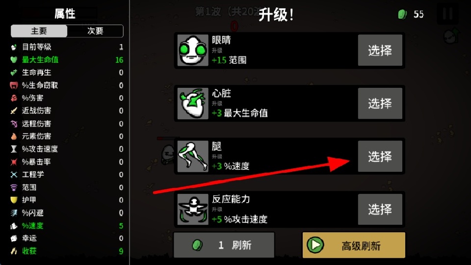 4、战斗获胜或达成升级条件后,会进入升级界面,可选择升级眼睛、心脏、腿、反应能力等属性,提升角色的各项能力。