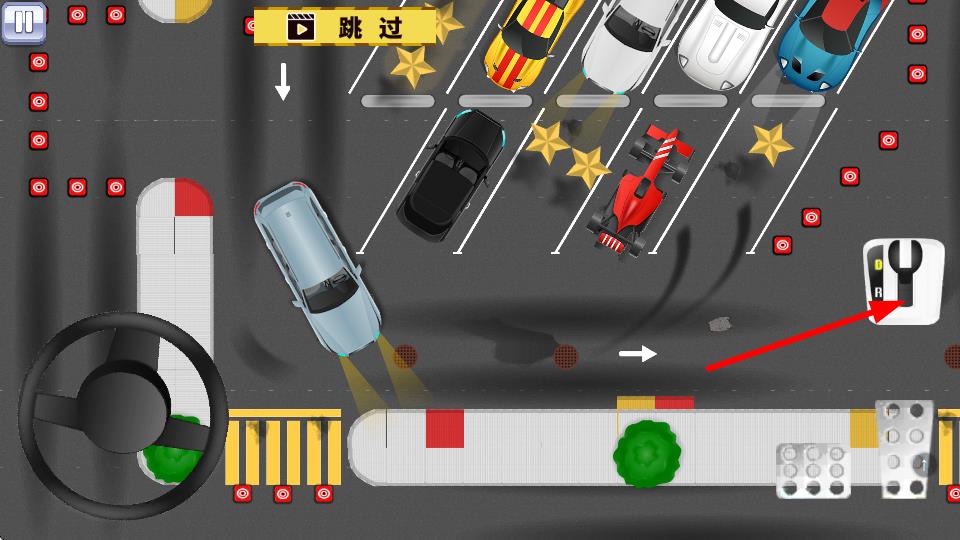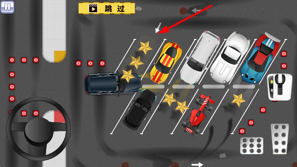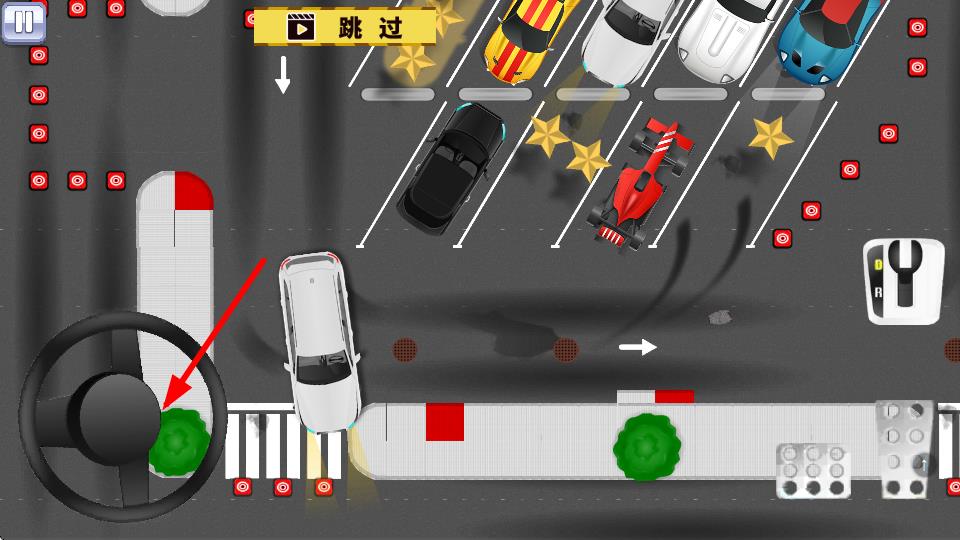 1、在停车场场景中,观察箭头指向的车辆,操控移动时需避开其他停放车辆,朝着箭头指示方向行驶,通过该区域。