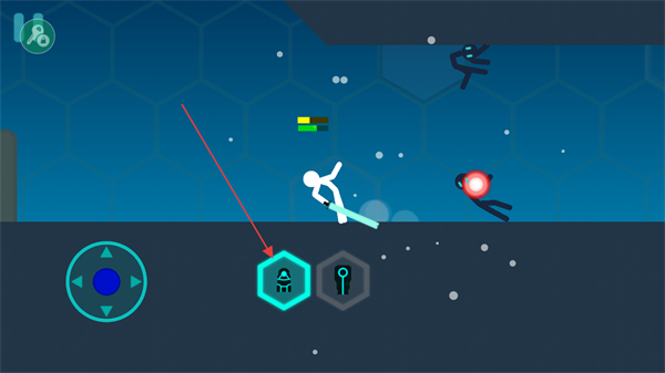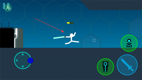 2、点击右侧剑形按钮,让火柴人挥舞长剑攻击敌人,可进行跳跃攻击等动作。