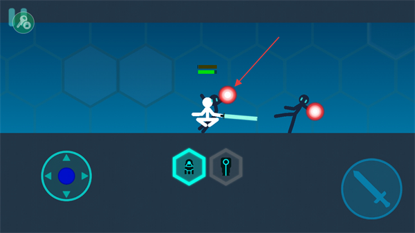 3、战斗中躲避敌方火柴人的红色光球攻击,同时用长剑反击,消耗其血量。