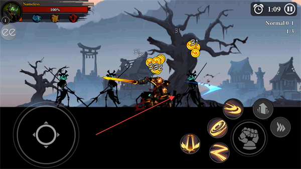 3、击败一波敌人后,向新的敌群移动,继续推进关卡进度。