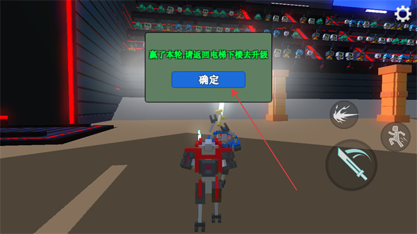 3、获胜后点击确定,返回电梯下楼升级机器人,提升战力。