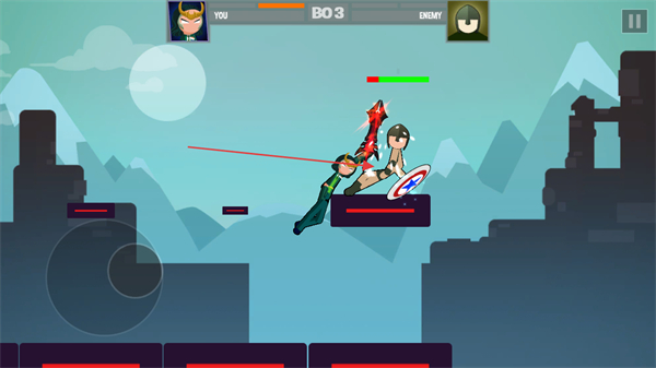 1、在场景中操控蜘蛛火柴人移动,利用武器与敌方火柴人战斗,注意走位躲避攻击。