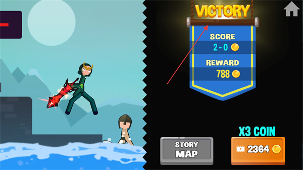 4、胜利后查看VICTORY界面,获取分数和金币奖励,可进入故事地图继续挑战。