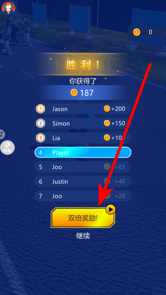 3、成功在比赛中获得胜利后,会进入奖励界面,此时可选择领取双倍金币奖励,这些奖励可用于后续提升角色或参与更多赛事。