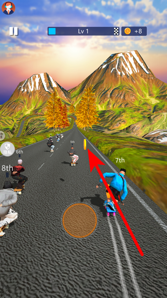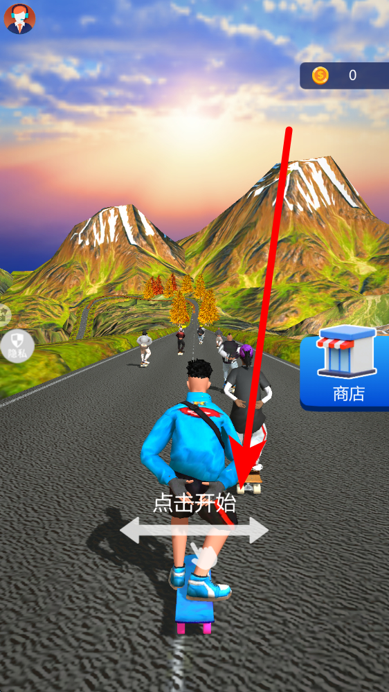 1、看到点击开始的提示,点击该提示区域,即可开启滑板竞技比赛,操控角色在赛道上与其他选手一同出发,展开排名角逐。