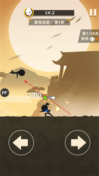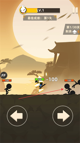 1、操控角色移动,攻击敌方火柴人,击败后提升等级至LV.2。