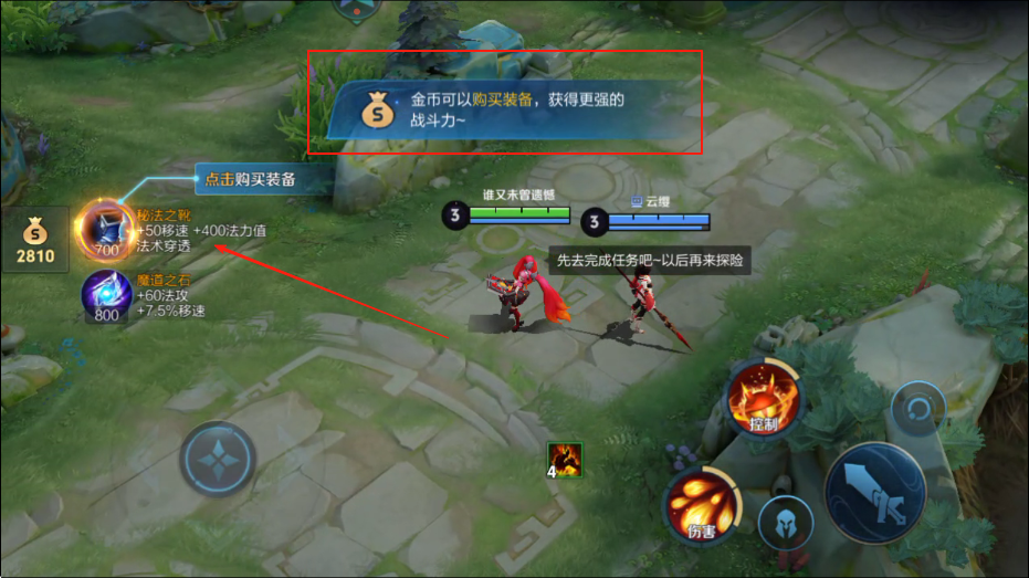 3、积攒足够金币后,看到左侧点击购买装备提示,点击进入装备购买界面,选择适合英雄的装备,购买后能提升英雄战斗力,助力后续战斗与发育。