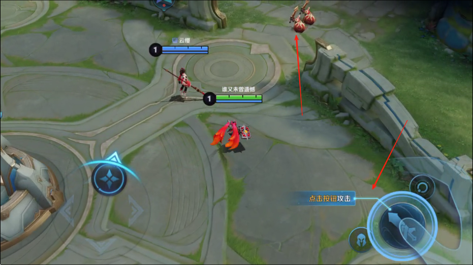 1、进入游戏对战,操控英雄移动到兵线处,看到右侧点击按钮攻击提示,点击攻击按钮,可对敌方小兵发起攻击,获取经验和金币。
