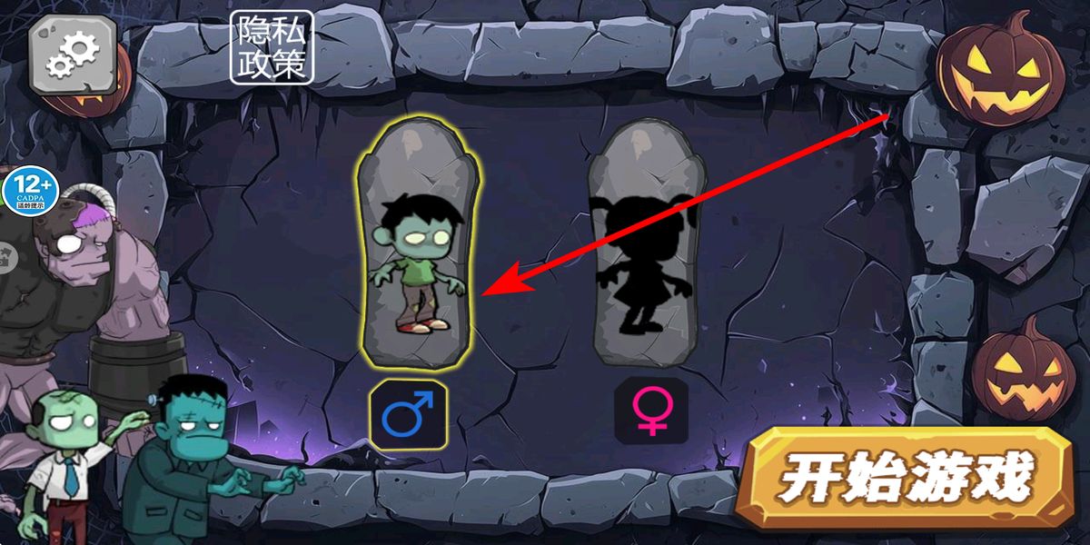 1、主界面点击男女僵尸角色如左侧男僵尸,确认后点开始游戏,进入场景,借虚拟操控移动,收集加速、无敌道具,为战斗与生存蓄力。