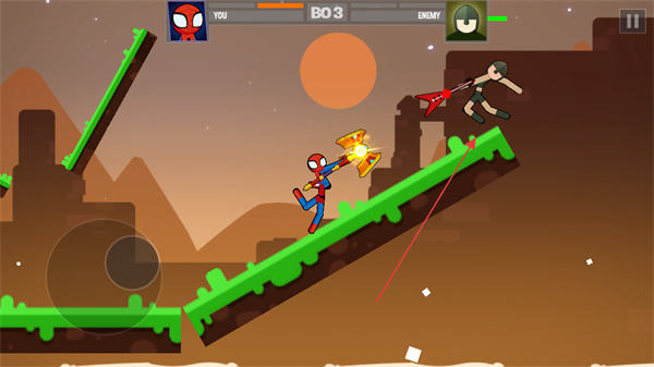 1、操控蜘蛛火柴人移动,利用武器攻击敌方,注意利用地形如倾斜平台调整站位。