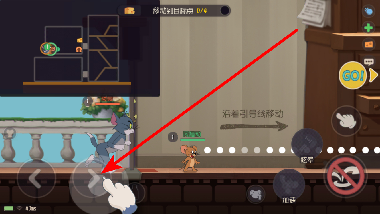 4、进入游戏像以杰瑞为例,利用移动按键控制角色移动,沿着引导线等提示,同时还能运用眩晕、加速等技能,与汤姆展开周旋,体验猫鼠追逐的乐趣。