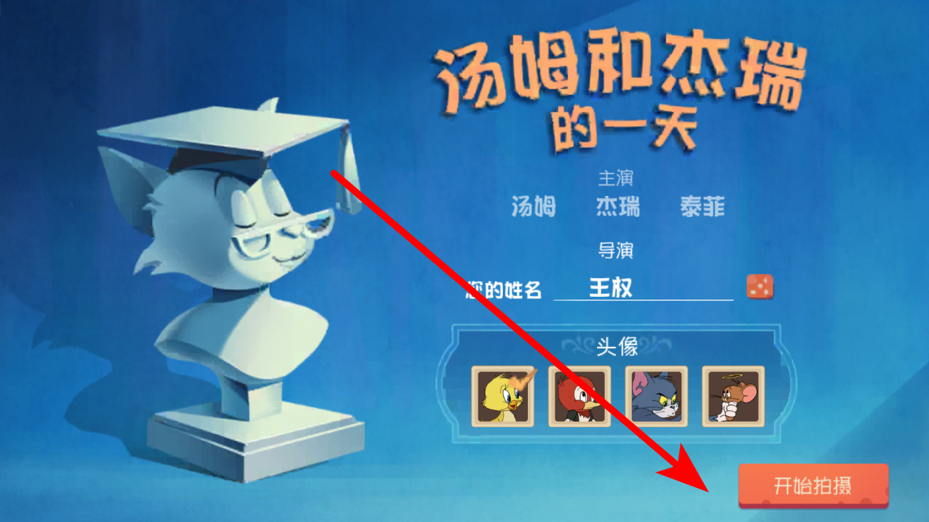 1、首先进入汤姆和杰瑞的一天,可设置姓名、选择头像,完成后点击开始拍摄,开启后续的游戏流程,为接下来的猫鼠互动做好准备。