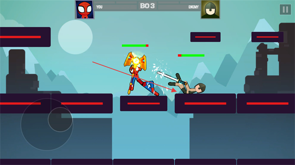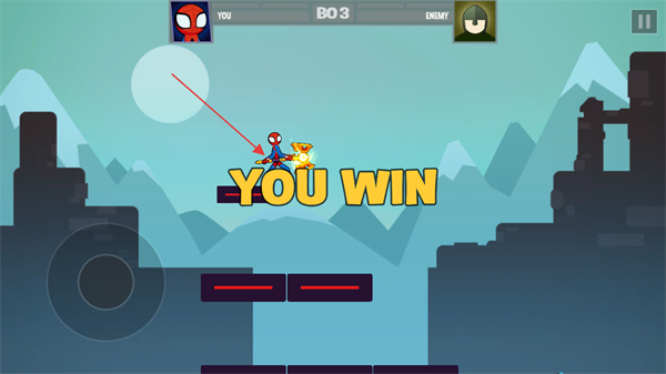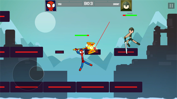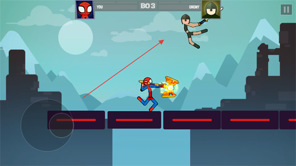 1、操控蜘蛛火柴人移动,利用武器攻击敌方火柴人,注意躲避其攻击。