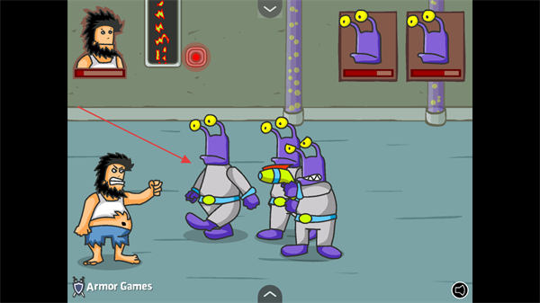 3、击败敌方流浪汉后,继续面对紫色外星人,利用拳击等动作攻击,躲避其武器攻击,逐步消耗其血量。