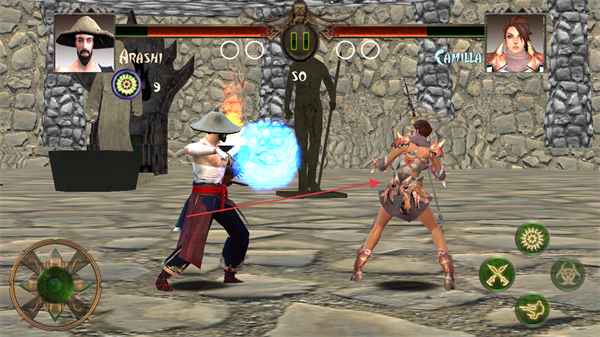 3、点击右侧技能按钮释放技能攻击对手,如蓝色能量球,造成伤害并积累优势。