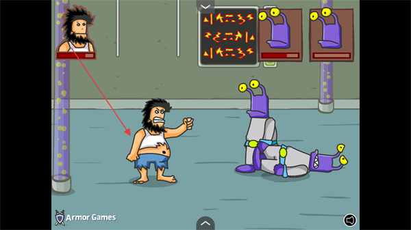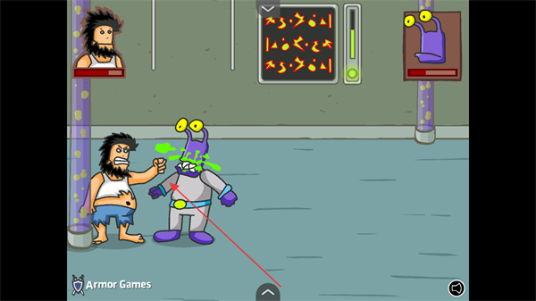 1、操控流浪汉与紫色外星人战斗,通过拳击等动作击败敌人,注意左上角的血量条。