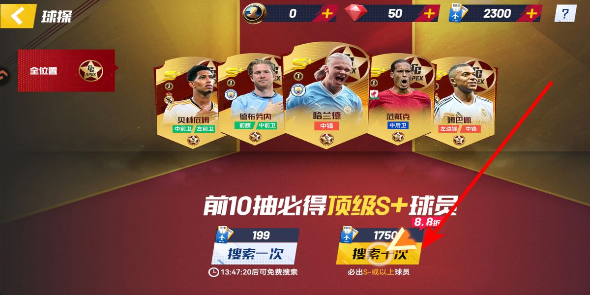 2、球探抽卡进入球探界面,利用前10抽必出顶级S加球员机制,优先选搜索十次享88折优惠,借折扣契机快速获取强力球星扩充阵容。
