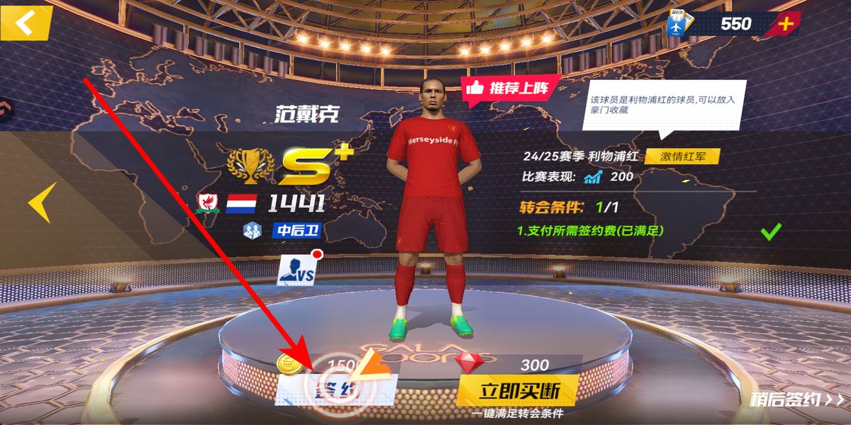3、球员签约待球员转会条件范戴克的签约费满足后,核查条件达成状态,点击签约按钮,将心仪球员纳入球会为战术体系补充战力。