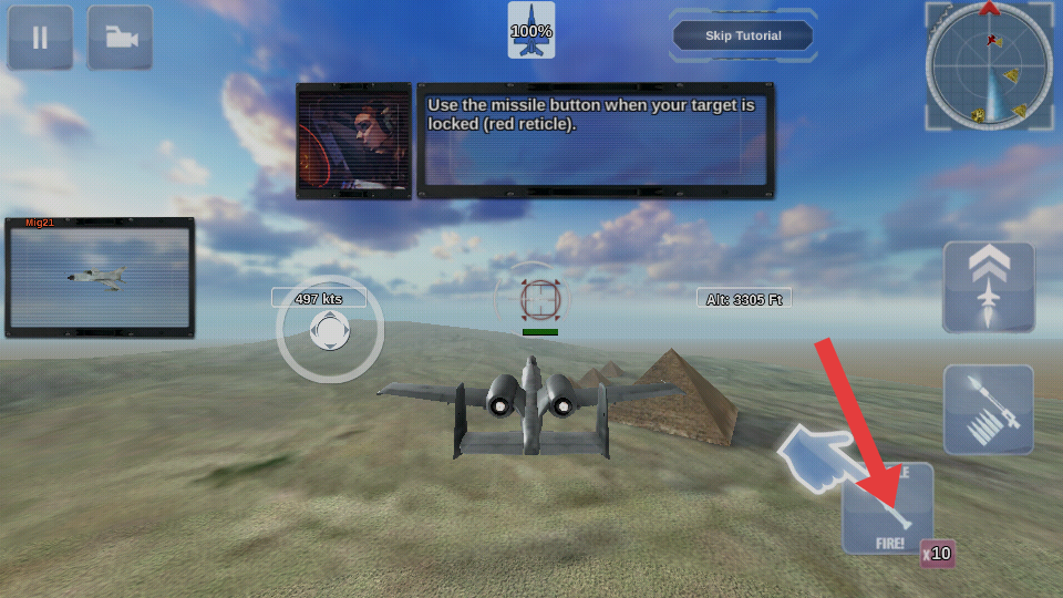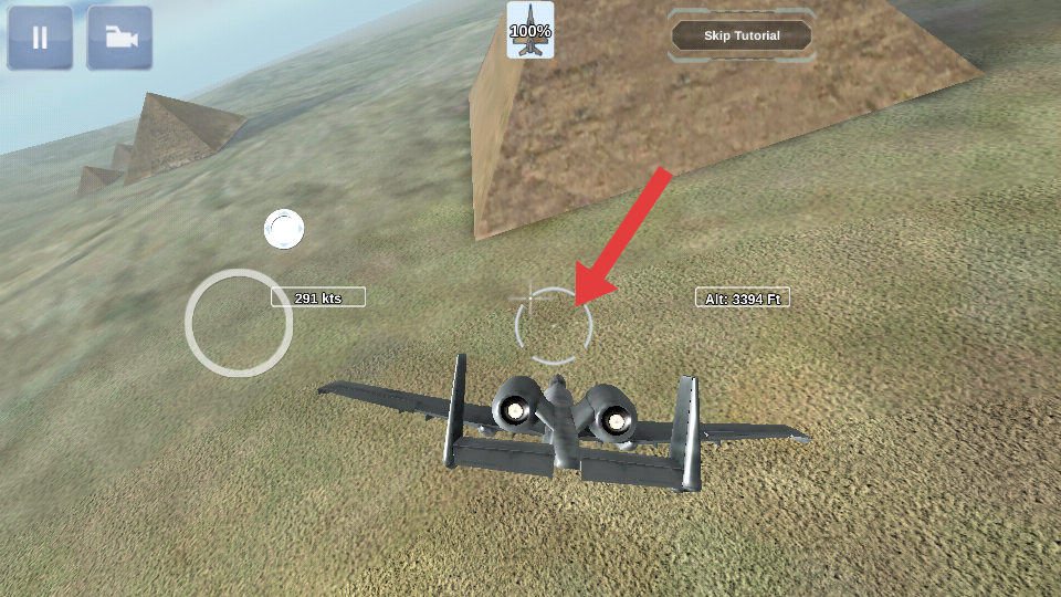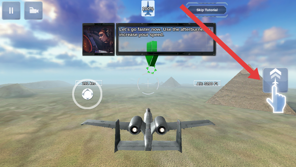 1、驾驶战机进入含金字塔景观的空域后,先熟悉基础操控,通过左侧摇杆调整飞行方向,右侧加力按钮对应加力燃烧室功能。