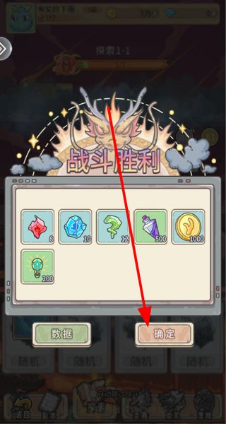 4、领取战斗奖励,战斗胜利后点击确定领取奖励,获取道具和金币等资源,用于角色养成和装备强化。