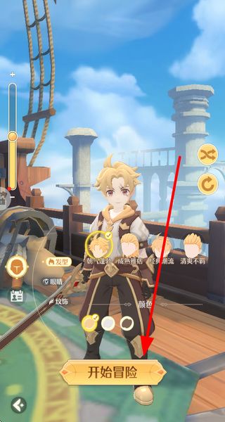 1、创建新手角色,在界面中选择喜欢的发型、服饰等自定义外观,点击开始冒险,正式进入奇幻的游戏世界。