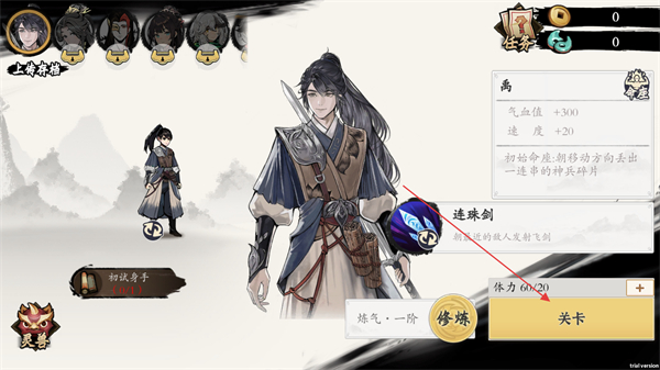 1、查看角色连珠剑技能,确认气血值+300等属性,点击关卡按钮进入伏魔战。