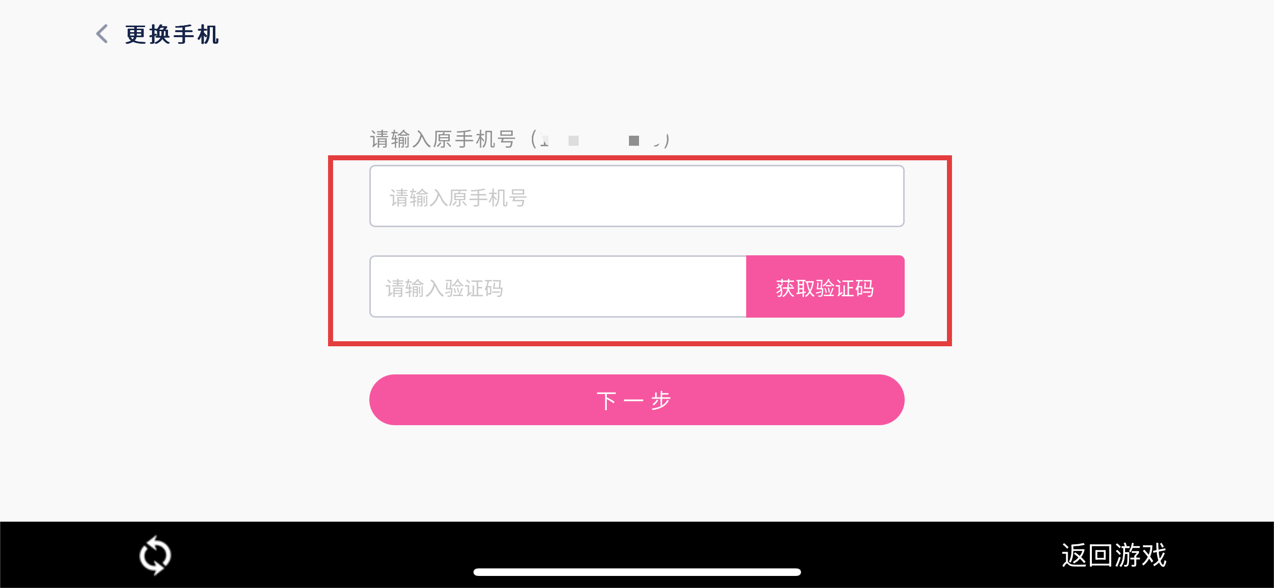 5、输入原手机号,将接收到的验证码填入对应输入框,完成后点击下一步。