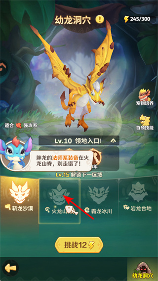2、在幼龙洞穴区域选择界面,点击火龙山脊选项进入挑战,这是区域挑战的核心步骤,需关注自身等级与宠物战力,推进以提升挑战效率。