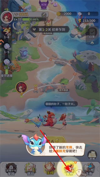 4、完成挑战后点击宠物按钮进入养成界面,这是提升战力的核心步骤,可为宠物穿戴龙骨等装备,优化宠物属性以适配后续更高难度挑战。