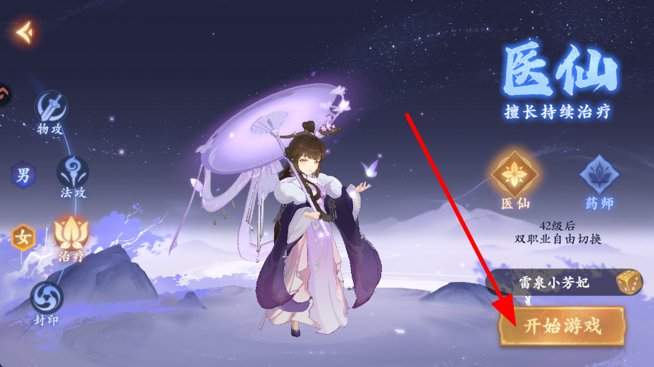 1、新人玩家在职业选择界面,可选择医仙等职业,医仙擅长持续治疗,选定职业后,点击开始游戏,即可进入封神世界。