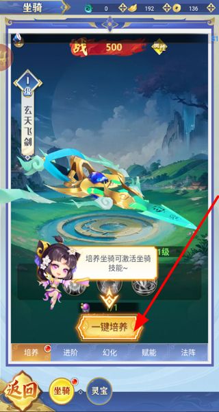 3、激活坐骑,一键培养玄天飞剑等坐骑,激活技能,提升属性,助力角色冒险。