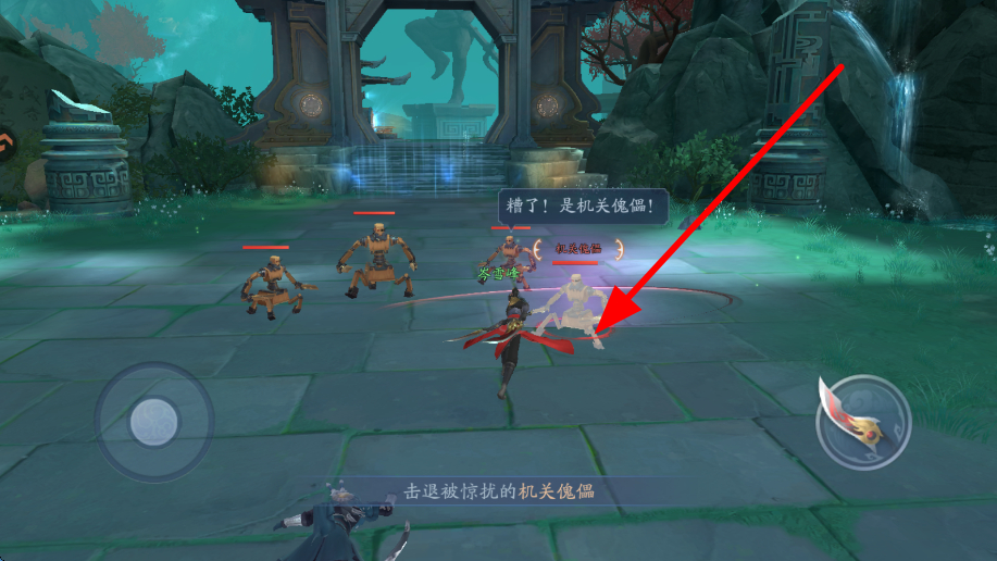 3、然后在任务过程中,若遇到机关傀儡等敌人,点击战斗攻击操作按钮,运用角色技能,与敌人展开战斗,推进任务进程。