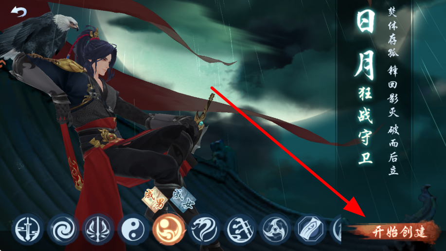 1、玩家首先创建职业选择,多种职业选项,挑选心仪的日月狂战守卫职业后,点击开始创建,进入人物外观自定义环节。