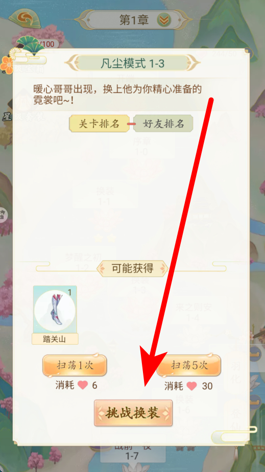 1、换装挑战时,可选择扫荡1次或扫荡5次,参与对应关卡的换装挑战,不同选择消耗不同数量的爱心,完成挑战有机会获得如踏关山等奖励。
