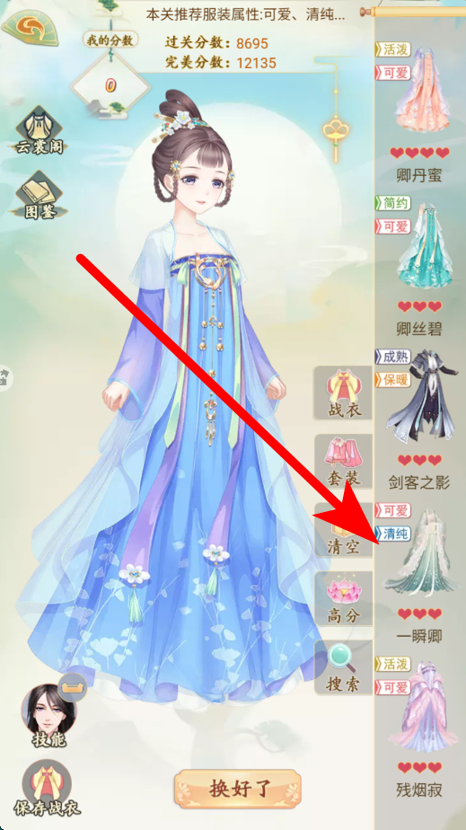 2、打扮角色需根据关卡推荐的服装属性,从众多服饰中挑选合适的进行搭配,搭配好后点击换好了,打造符合关卡要求的角色形象,助力通关。