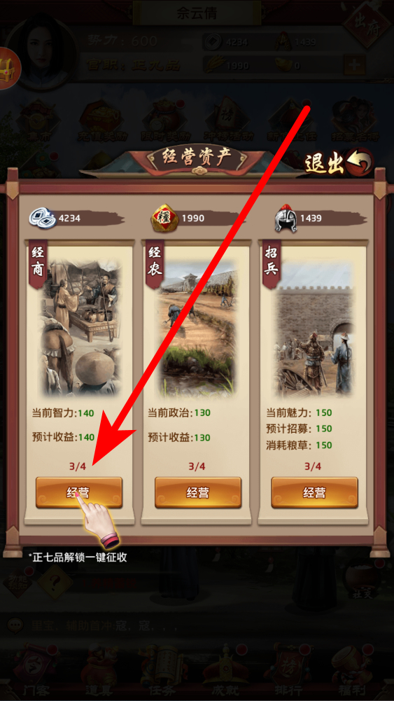 3、接着经营资产,进入经营资产界面,可选择经商、经农、招兵等不同经营方向,点击对应的经营按钮,开展经营活动,获取收益。