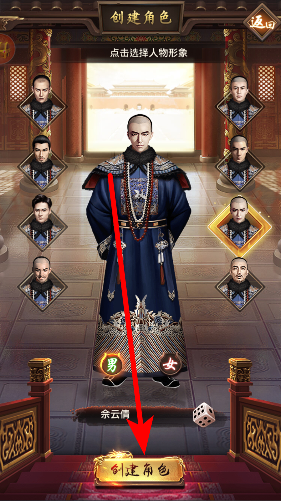 1、首先创建角色,在创建角色界面,选择喜欢的人物形象,确定性别等设定后,点击创建角色按钮,开启官场之旅。