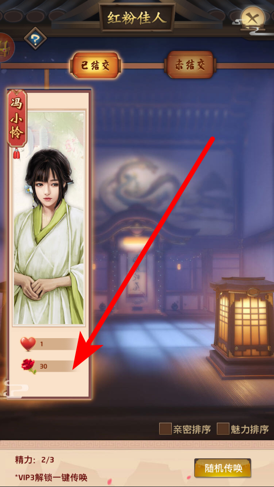 4、最后结交佳人,在红粉佳人界面,可与已结交的佳人互动,通过赠送物品等方式,提升与佳人的关系,丰富游戏体验。