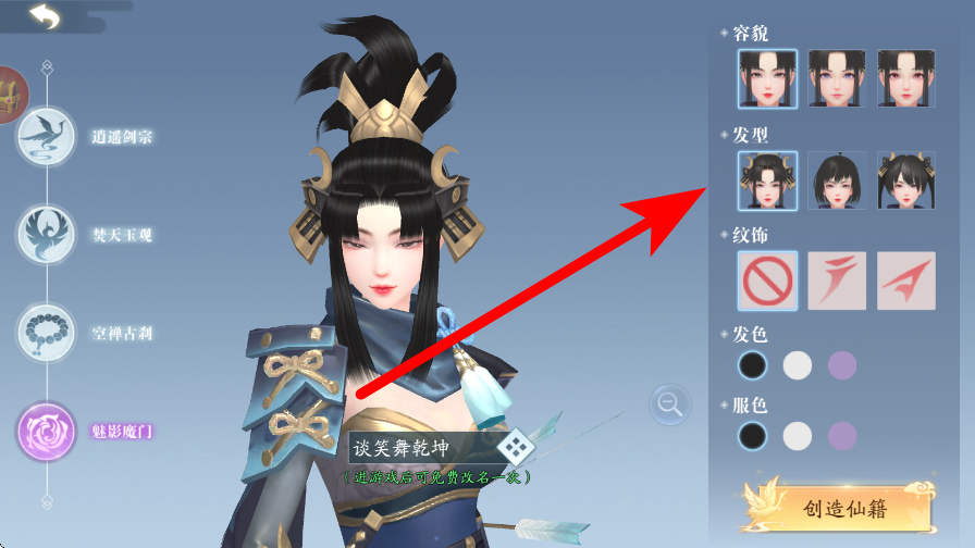2、然后进行捏脸,进入捏脸能选择容貌、发型等,打造出符合自己心意的仙侠角色形象,让角色更具个性,之后点击创造仙籍完成角色创建。