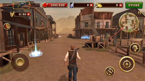 1、用左侧摇杆操控牛仔在西部小镇移动,熟悉场景,准备完成任务。