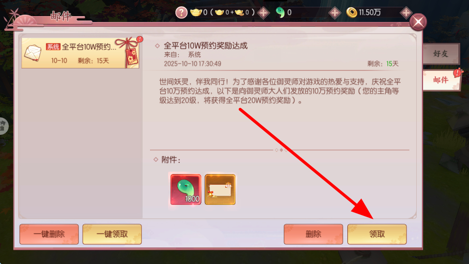 4、邮件福利领取,系统发送的邮件,如全平台预约奖励邮件,点击领取,获取邮件中福利的东西。