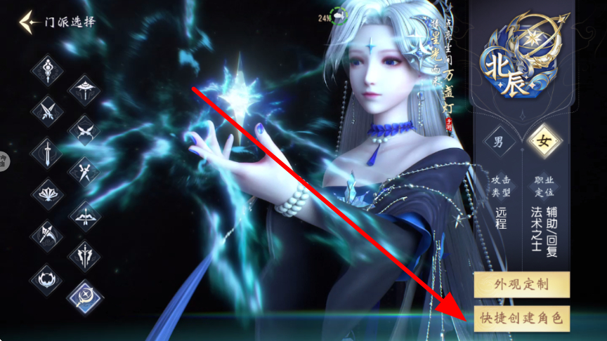 1、新手可选择不同门派,像北辰这类法术、兼具辅助与回复能力的门派,选好门派后,点击创建角色,开启武侠冒险之旅。