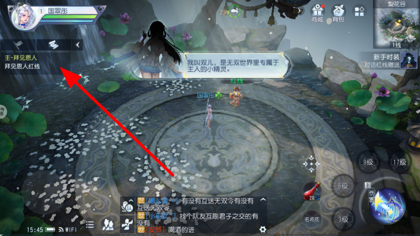 2、进入游戏后,会有主线任务指引,拜见恩人红线等任务,推进主线任务进程,在完成任务过程中了解武侠世界的故事,提升角色实力。