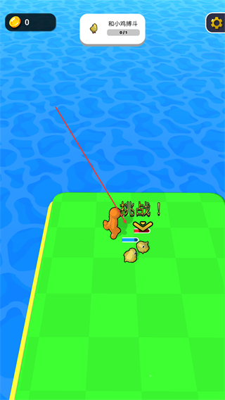 1、点击挑战!,操控橙色精灵与小鸡搏斗,推进对战进程。