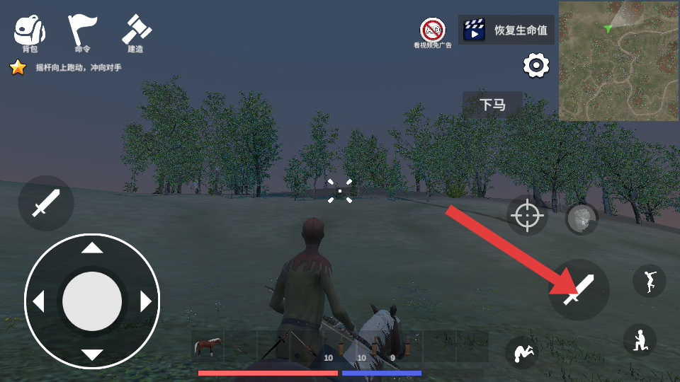 1、先靠近场景中的马匹,点击骑乘按钮解锁骑马功能,骑马状态下可大幅提升移动速度,更高效地在村庄与城市之间穿梭。