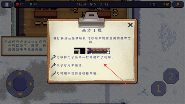 4、了解基本工具用途,勺子可当简易铲子,叉子可凿墙,刀可切割栅栏和篱笆,为逃离做准备。