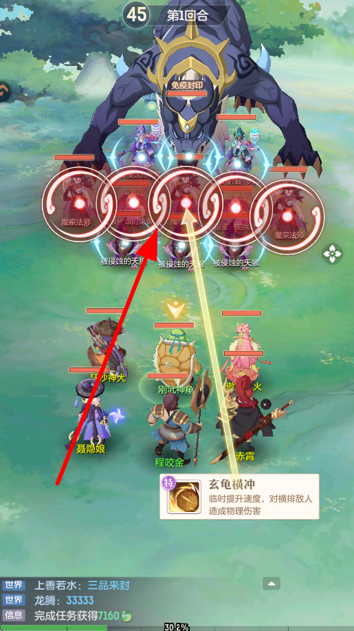 4、战斗时,面对敌人,玩家可操控角色及伙伴,选择合适的技能,如玄龟横冲,能临时提升速度,对横排敌人造成物理伤害,合理释放技能,战胜敌人推进进程。
