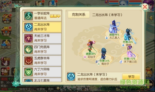 二龙出水阵:追求速度和伤害。克制一字长蛇阵、八门金锁阵、五虎群羊阵、北斗七星阵